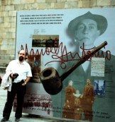 Bajo la hégira de la familia. Pérez Poza posa ante el mural en homenaje a su tío abuelo, el poeta Manoel-Antonio.